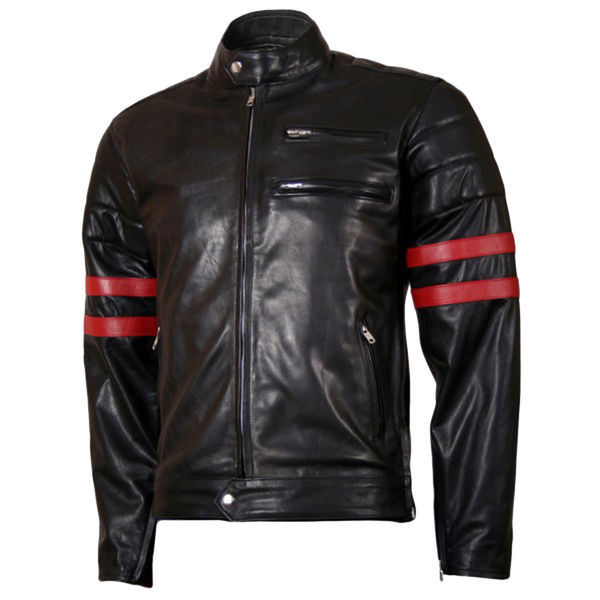 Mens Leather Jacket Black Lambskin Biker Moto Red Stripes